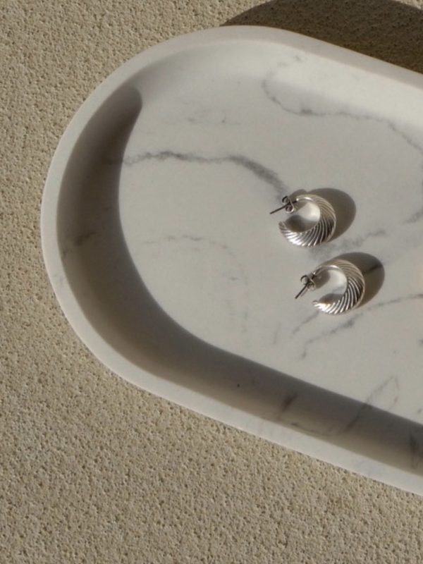 Hoop earrings with line pattern, diameter 2 cm, made of  silver plated brass and steel nail.